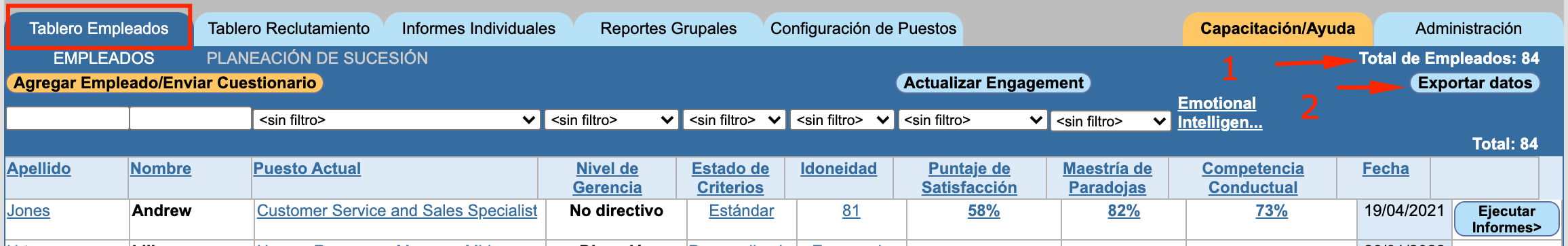 En la parte superior nos muestra (1) el número total de empleados dados de alta en su sistema, (2) podrá exportar toda la lista de empleados en un archivo disponible para Excel.